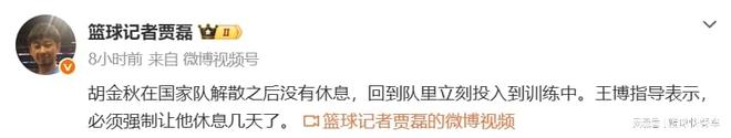 而在结束男篮世预赛后,胡金秋也跟随中国队回到北京,并且各自解散回家。在离开国家队以后,胡金秋并没有偷懒,也没有选择休息,直接就回到了球队,跟随球队一起训练。而对于胡金秋这种劳模精神,作为广厦主教练王博,他已经心疼坏了。毕竟,广厦队目前就只有胡金秋这样一个顶尖内线,一旦他受伤了,对于广厦而言,确实是灭顶之灾。
